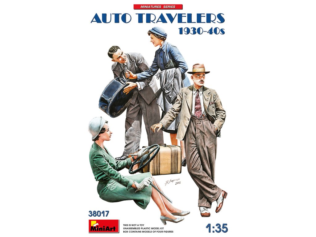 Das Set Auto Travelers 1930s-40s im Maßstab 1:35 zeigt Zivilisten auf der Straße in der Zwischenkriegs- und Kriegszeit. Enthält Figuren von Männern, Frauen und Gepäck, perfekt für Dioramen mit Oldtimern.