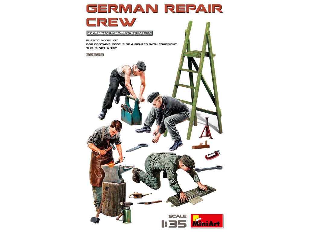 MiniArt's German Repair Crew 1/35 Modellbausatz zeigt die deutsche Reparaturmannschaft des Zweiten Weltkriegs bei der Arbeit an ihrer Ausrüstung. Enthält mehrere Figuren in realistischen Posen und Werkzeugen. Das Paket enthält keine Farbe oder Klebstoff für die Montage benötigt.