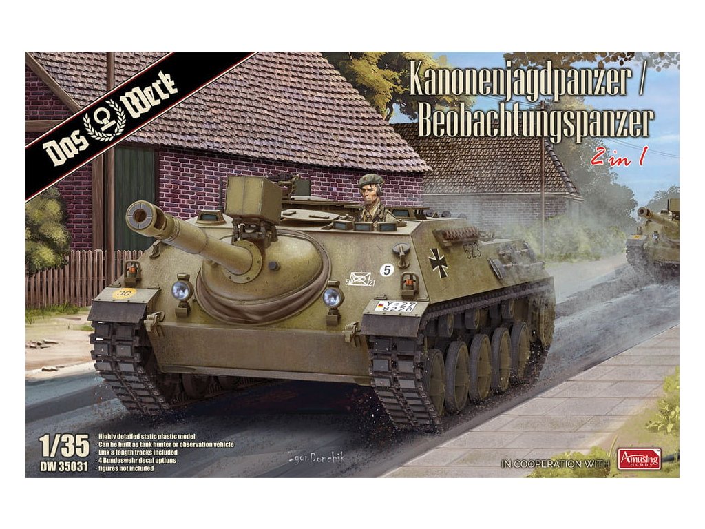 Das Werk 1/35 Kanonenjagdpanzer / Beobachtungspanzer ist ein Bausatz eines deutschen Nachkriegsjagdpanzers und seiner Beobachtungsvariante, mit dem man eine von zwei Versionen aus dem Kalten Krieg bauen kann. Das Paket enthält nicht die Farbe oder Klebstoff für die Montage benötigt.