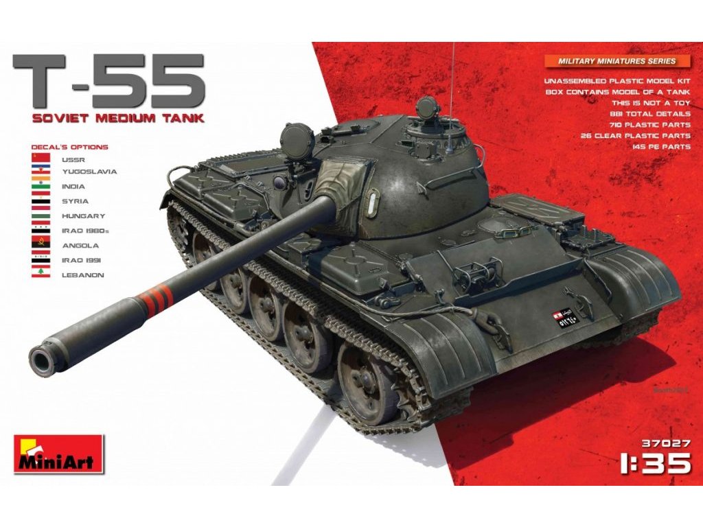 Der T-55 Soviet Medium Tank von MiniArt ist ein Modell eines klassischen sowjetischen mittleren Panzers aus dem Kalten Krieg im Maßstab 1:35. Der Bausatz enthält detaillierte Kunststoffteile, einschließlich vollständig wiedergegebenem Innenraum, Motorraum und Bewaffnung. Das Paket enthält keine Farbe oder Klebstoff für die Montage benötigt.