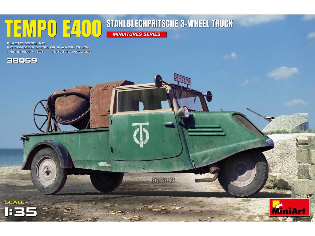 MiniArt's 1/35 Modell des dreirädrigen Tempo E400 Stahlblechpritsche ist ein ziviles deutsches Auto aus den 1930er-1940er Jahren. Das Paket enthält keine Farbe oder Klebstoff für die Montage benötigt.