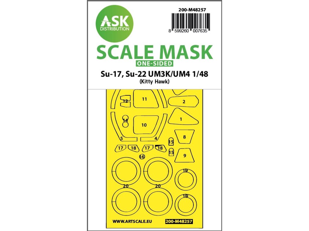 Art Scale Kit Distribution (ASK) stellt vorgestanzte und nummerierte Abdeckbögen für Plastikmodelle her. Die Masken sind in erster Linie für das Abkleben von Kabinen und Rädern gedacht, erleichtern aber auch das Abkleben anderer Teile des Modells. Jedes Kit wird für einen bestimmten Modellbausatz im entsprechenden Maßstab empfohlen, um maximale Genauigkeit und Benutzerfreundlichkeit zu gewährleisten.