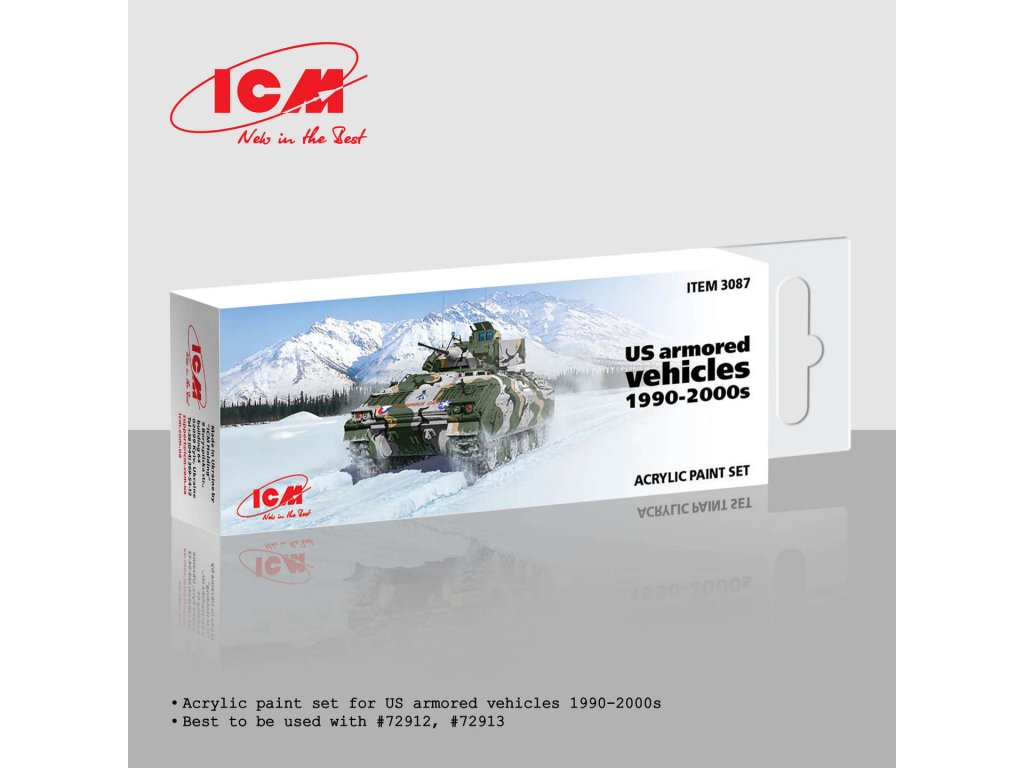 Die gepanzerten Fahrzeuge der USA aus den 1990er und frühen 2000er Jahren wurden häufig bei Operationen im Nahen Osten und bei friedenserhaltenden Maßnahmen eingesetzt. Ihre Tarnschemata kombinierten Grün- und Brauntöne mit Komplementärtönen, die eine Anpassung sowohl an europäische Umgebungen als auch an Wüstenbedingungen ermöglichten. Dieser Farbsatz von ICM bietet Modellbauern die notwendigen Farbtöne, um ein realistisches Aussehen der Ausrüstung zu erreichen, die das Rückgrat der amerikanischen Bodentruppen in den 1990er und frühen 2000er Jahren bildete.
