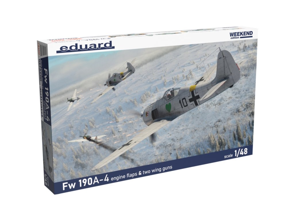 Eduard Fw 190A-4 w/ engine flaps & 2-gun wings 1/48 ist ein Bausatz eines deutschen WWII-Jagdflugzeugs, speziell der frühen A-4-Variante, ausgestattet mit A-4 A-4 mit Motorkühlklappen und 2-Kanonen-Flügel, hergestellt in Weekend-Edition mit detaillierten Kunststoffteilen und Abziehbildern für vier Tarnschemen. Das Paket enthält nicht die Farbe oder Klebstoff für die Montage benötigt.