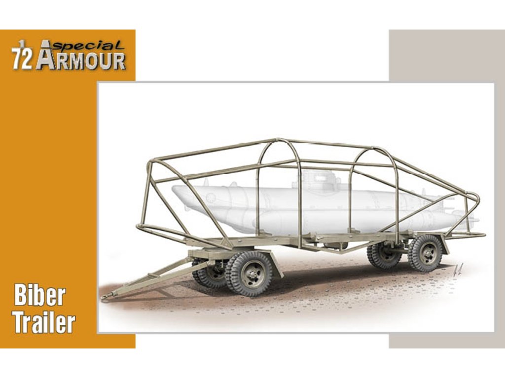 Biber Trailer im Maßstab 1/72 von Special Hobby zeigt einen speziellen Transportanhänger, der für den Transport deutscher Biber-Mini-U-Boote während des Zweiten Weltkriegs entwickelt wurde. Die Biber Mini-U-Boote waren Teil der deutschen Bemühungen, kompakte Angriffsboote einzusetzen, die in Küstengewässern operieren und alliierte Schiffe mit Torpedos angreifen sollten. Um sie von den Produktionsstätten zu den Stützpunkten und Abschussplätzen zu transportieren, wurde ein spezielles Transportgerät, der Biber-Anhänger, benötigt.