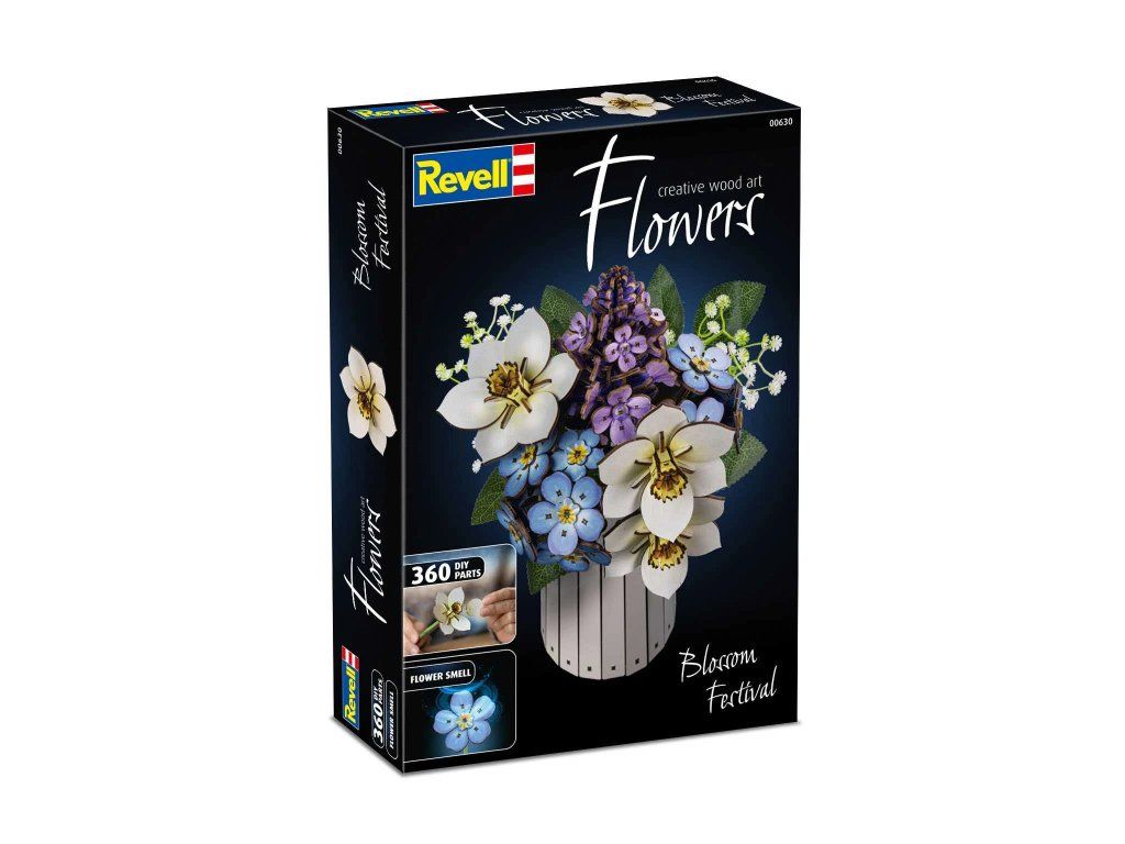 REVELL Flowers 00630 - Blossom Festival is a wooden kit of a flower bouquet with a vase designed to be assembled. The resulting decoration reaches a height of 32 cm and consists of 360 finely crafted pieces that faithfully imitate the organic shapes of real flowers and leaves. The package includes a stylish vase, an integrated scent ring for an olfactory experience and easy-to-follow instructions. The kit combines the relaxing process of creating with a lasting home decoration that, unlike live flowers, will never fade. Designed for ages 14 and up. The package does not include fragrance for the scent ring.