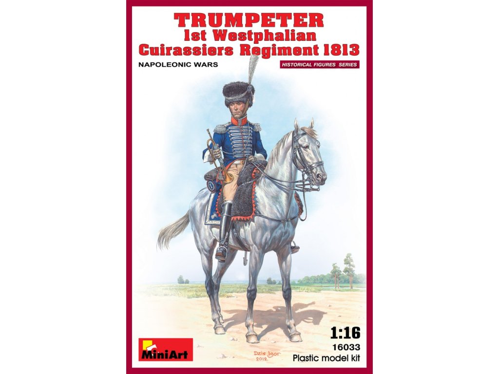 Táto figúrka MiniArt v mierke 1:16 predstavuje príslušníka 1. pluku vestfálskych kyrysníkov z obdobia napoleonských vojen, konkrétne ako trubača. Tento elitný jazdecký pluk bol súčasťou pruskej armády a vyznačoval sa ťažkou jazdeckou výzbrojou, typickými kyrysmi a nádhernými uniformami.