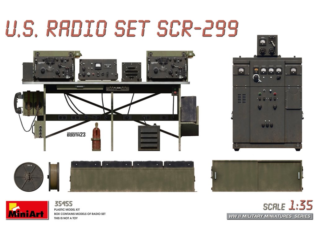 Model americkej rádiostanice SCR-299 v mierke 1/35 od spoločnosti MiniArt predstavuje ikonickú americkú poľnú rádiostanicu z druhej svetovej vojny. Súprava obsahuje detailné vybavenie interiéru rádiostanice, príslušenstvo a realistické stvárnenie vybavenia signalizačnej jednotky. Balenie neobsahuje farby ani lepidlá potrebné na zostavenie.