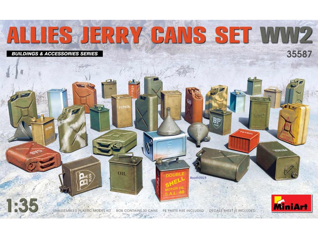 MiniArt 1/35 Allies Jerry Cans Set WW2 je doplnková sada plastových dielov, ktorá obsahuje kanistre rôznych typov, palivo sudy, prepravky a ďalšie drobné príslušenstvo používané spojeneckými armádami počas 2. svetovej vojny. Všetky predmety sú vyrobené s dôrazom na verný historický dizajn a autentické detaily.