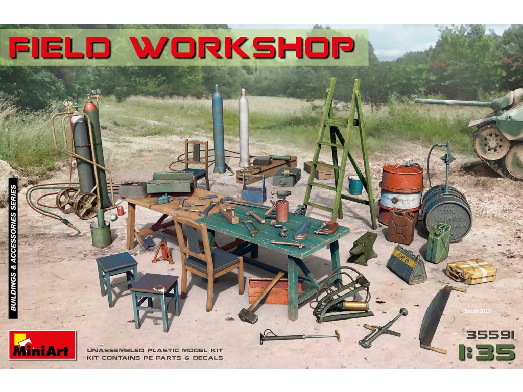 Stavebnica MiniArt 1/35 Field Workshop ponúka komplexný model poľnej dielne vhodnej pre armádne technické zariadenia a civilné prostredie počas 2. svetovej vojny. Táto súprava je ideálna ako súčasť väčších diorám a scén s tematikou servisu alebo opráv. Obsahuje široký výber dielov, ako sú pracovné stoly, náradie, nádrže, boxy, kliešte, zveráky, vŕtačky, ako aj ďalšie vybavenie dielne.