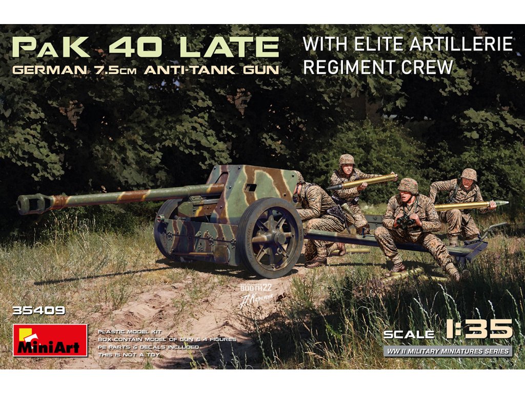 Nemecký model 7.5cm protitankový kanón PaK 40 Late w/Elite Artillerie Regiment Crew v mierke 1/35 od MiniArtu je detailným stvárnením nemeckého protitankovéhoNemecké delo z obdobia neskorej druhej svetovej vojny vrátane posádky v poľných uniformách elitnej delostreleckej jednotky. Balenie neobsahuje farby ani lepidlo potrebné na montáž.