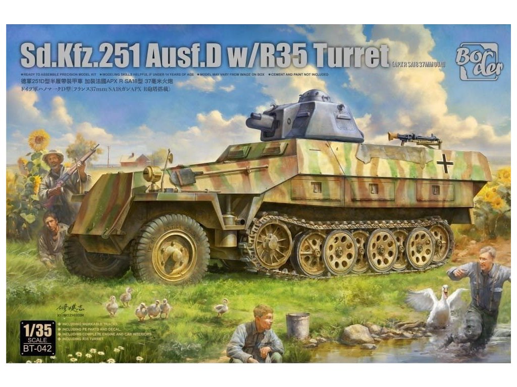Border Model 1/35 Sd.Kfz.251 Ausf.D s vežou R35 je detailný model unikátnej poľnej modifikácie nemeckého polopásového transportéra, na ktorý bola nainštalovaná veža ukoristeného francúzskeho tanku Renault R35. Tento nezvyčajný stroj ilustruje improvizáciu nemeckých vojsk na konci druhej svetovej vojny. Balenie neobsahuje farby ani lepidlo potrebné na montáž.