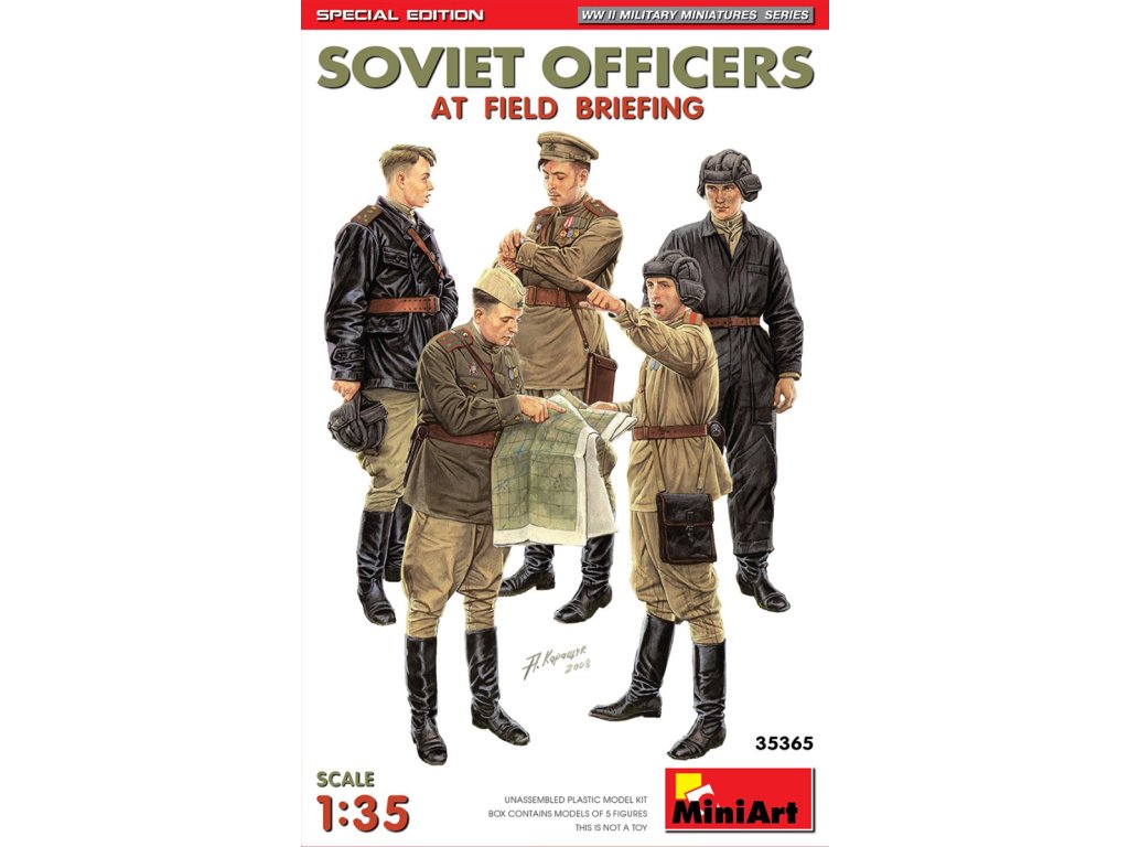 Model sovietskych dôstojníkov na poľnom brífingu. Špeciálna edícia MiniArtu v mierke 1/35 obsahuje sadu sovietskych dôstojníkov na poľnom brífingu. Figúrky zachytávajú prirodzené pózy a dobové uniformy z obdobia druhej svetovej vojny. Balenie neobsahuje farby ani lepidlo potrebné na zostavenie.