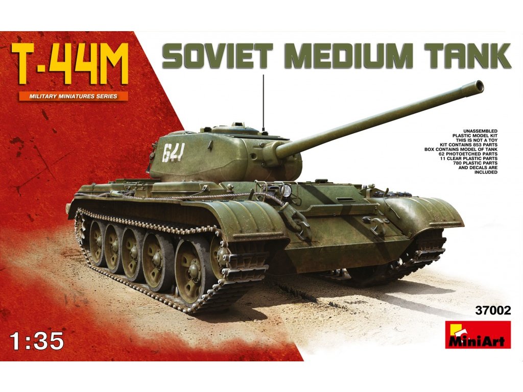Model T-44M od spoločnosti MiniArt v mierke 1/35 je modernizovanou verziou sovietskeho stredného tanku T-44 z obdobia po druhej svetovej vojne. Stavebnica obsahuje detailné plastové diely, kompletný interiér a realistický motorový priestor. Balenie neobsahuje farby ani lepidlo potrebné na montáž.