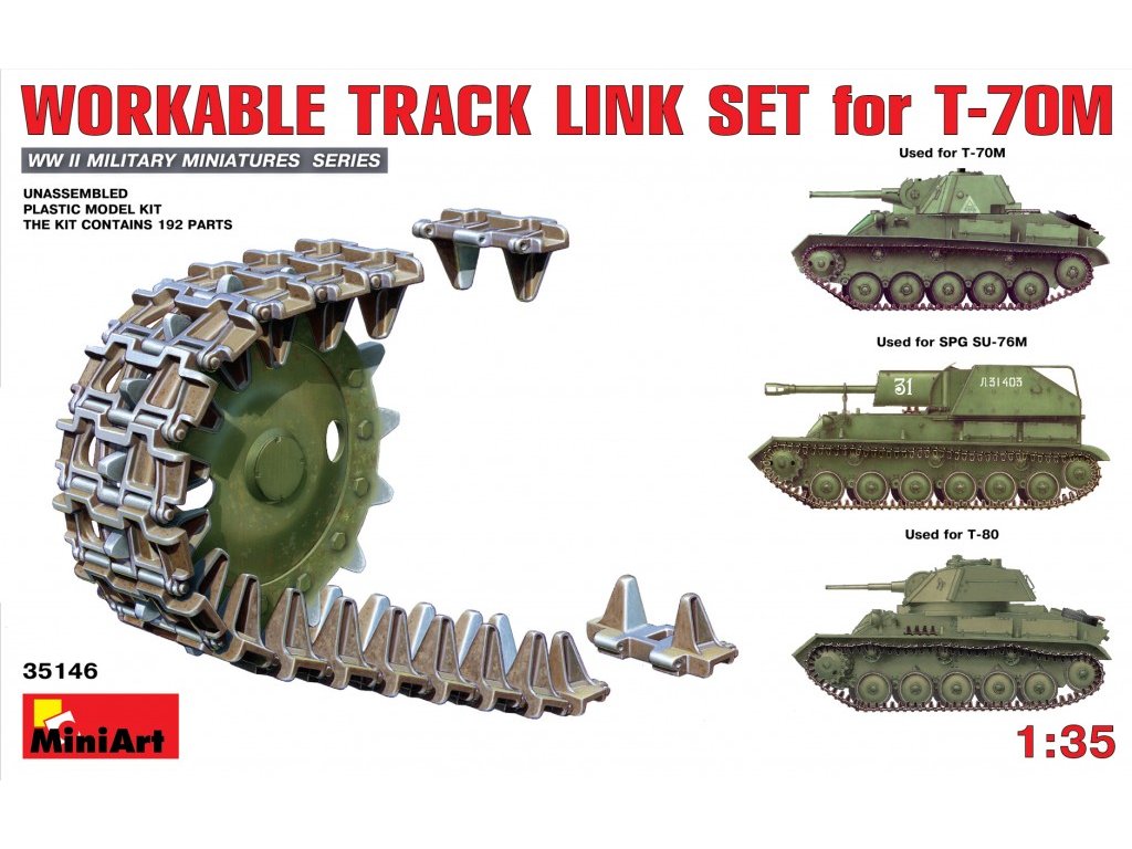 Sada funkčných pásových spojov pre ľahký tank T-70M v mierke 1/35 od spoločnosti MiniArt ponúka plne pohyblivé pásové spoje určené pre modely sovietskeho ľahkého tanku T-70M z obdobia druhej svetovej vojny. Každý pás sa skladá z jednotlivých dielov, ktoré sa dajú spájať bez potreby lepenia, čo umožňuje ich prirodzené prehýbanie a pohyb po nasadení na podvozok.