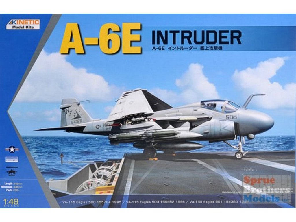 Kinetic 1/48 A-6E Intruder je model palubného útočného lietadla amerického námorníctva z obdobia studenej vojny a konfliktov v Perzskom zálive. Stavebnica ponúka detailné stvárnenie tohto slávneho stroja, ktorý bol nasadený od Vietnamu až po operáciu Púštna búrka. Balenie neobsahuje farby ani lepidlá potrebné na zostavenie.