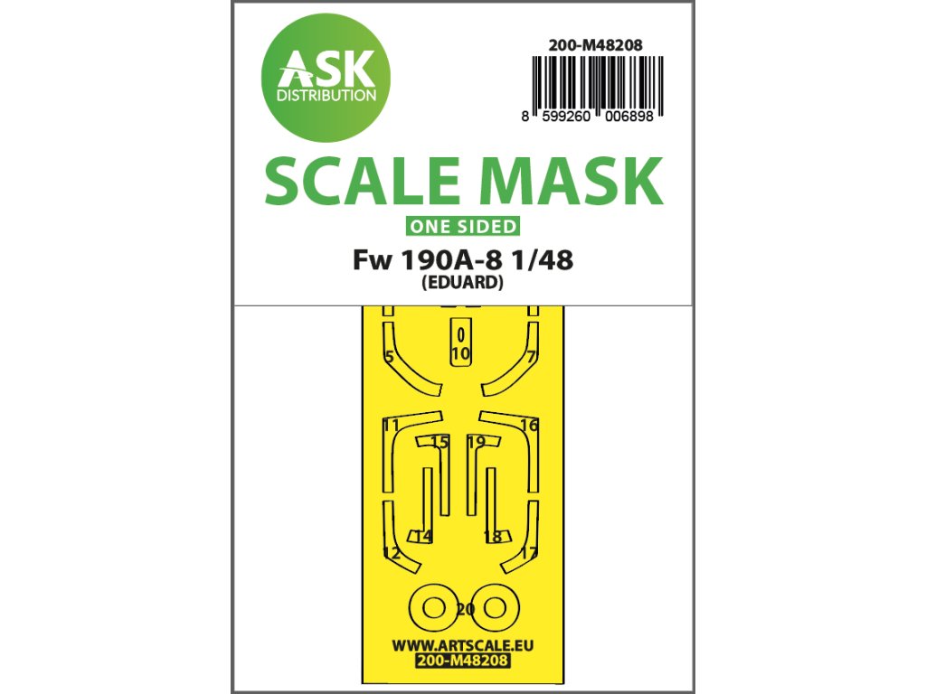 Jednostranná samolepiaca maska z čírych dielov a kolies pre stavebnicu Eduard 1/48 Fw 190A-8. Katalógové číslo ASK Distribution: 200-M48208