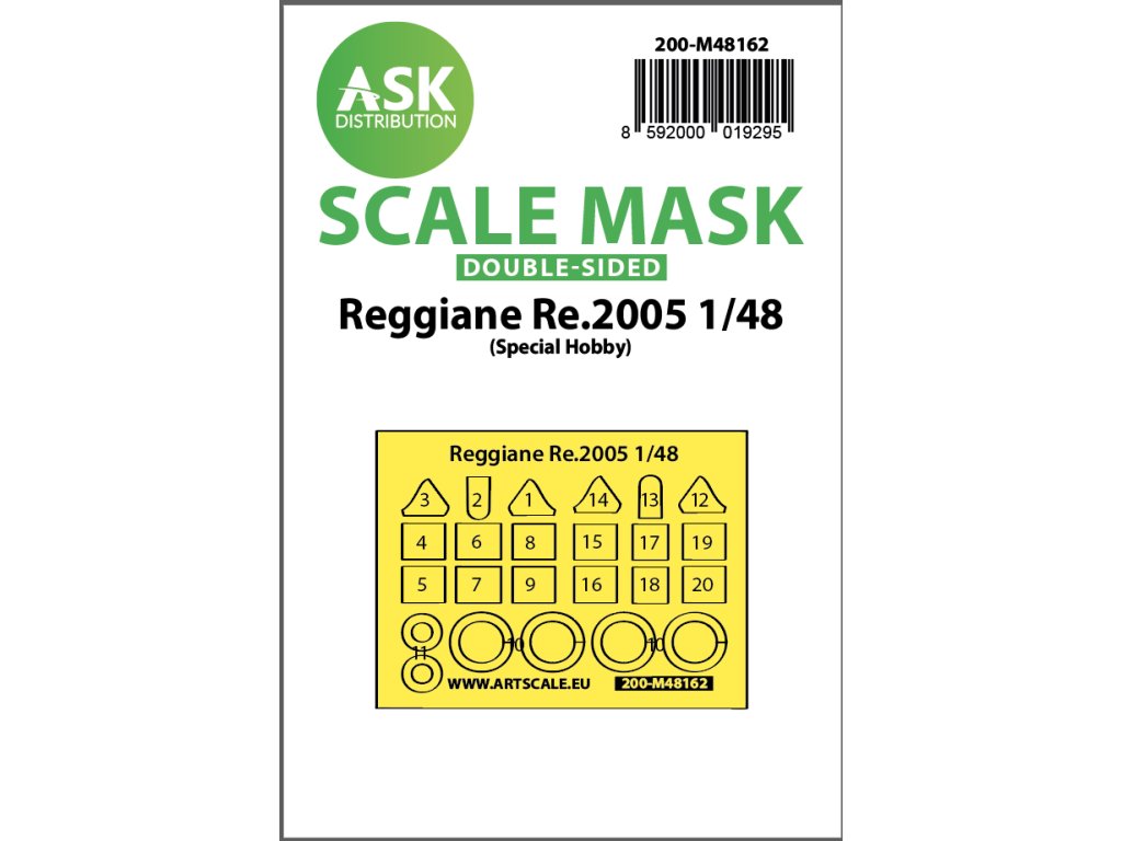 Obojstranná priehľadná maska a masky kolies 1/48 Reggiane Re.2005 pre stavebnicu Special Hobby, katalógové číslo 200-M48162. Predseknutá maskovacia fólia Kabuki najvyššej kvality, najlepšia technologická výroba prierezu fólie. Všetky časti masky sú potlačené číslami, ktoré spolu s návodom určujú presnú polohu, môžua aplikáciu na maskovaný model - veľké uľahčenie práce vedúce k dokonalému modelu.