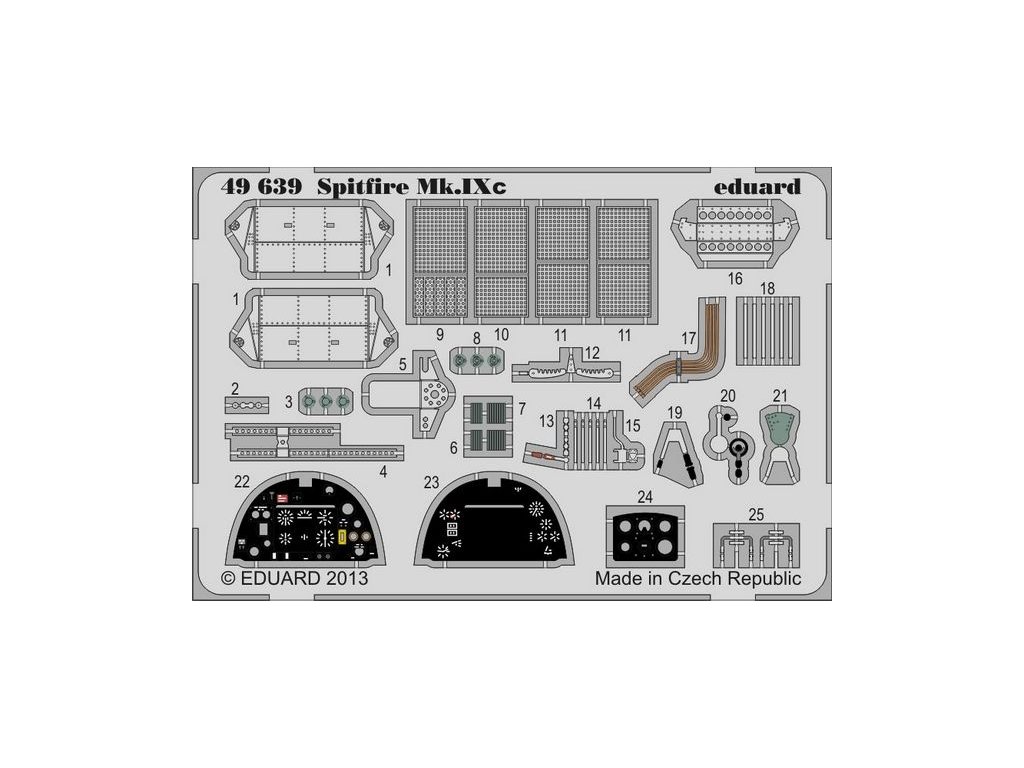 Jednostranná samolepiaca maska 1/48 Spitfire Mk.IXc z čírych dielov a masky kolies pre stavebnicu Eduard. Katalógové číslo 200-M48143. Predseknutá...