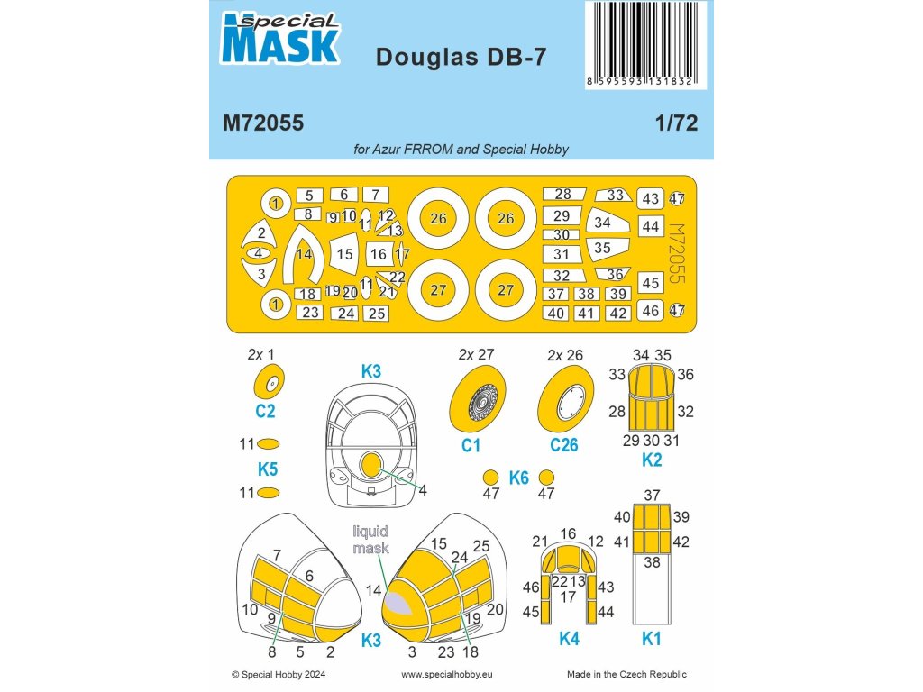 Táto sada kamuflážnych šablón v mierke 1/72 pre DB-7 od Special Hobby vám umožní presne zamaskovať kokpit a ďalšie priehľadné časti stavebnice počas maľovania. Šablóny sa presne prispôsobujú tvarom skla, uľahčujú nanášanie farby a zabezpečujú ostré línie farby. Vyrobené z vysokokvalitného materiálu, ktorý sa ľahko aplikuje a odstraňuje. Balenie neobsahuje farby ani lepidlá potrebné na montáž.