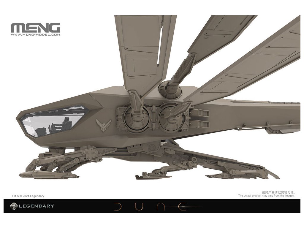 Stavebnica obsahuje štyri figúrky posádky, detailný kokpit s priehľadnými dielmi a ďalšie drobné príslušenstvo. Model je ideálnym zberateľským kúskom pre fanúšikov sveta DUNE a modelárov so záľubou v sci-fi technológiách.