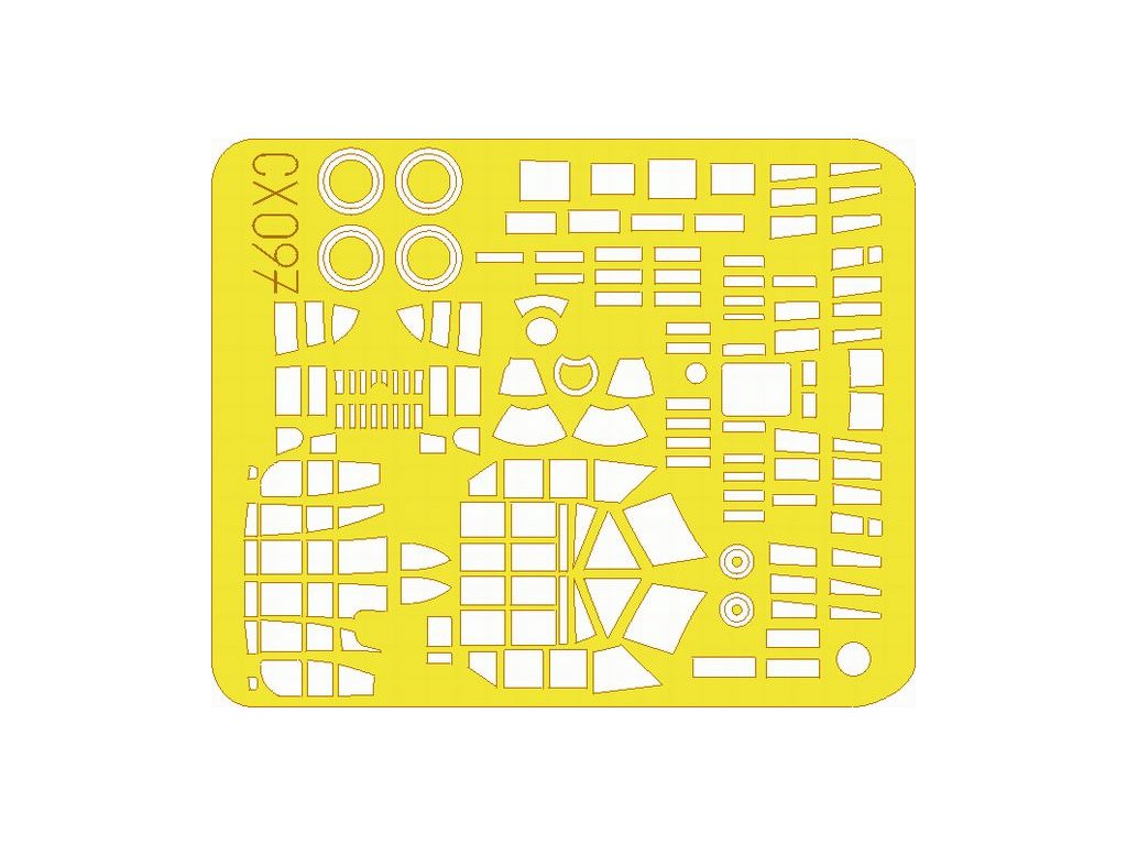 Jednostranná samolepiaca maska 1/48 Messerschmitt Bf 110E z čírych dielov a masky kolies pre stavebnicu Eduard. Katalógové číslo 200-M48189....