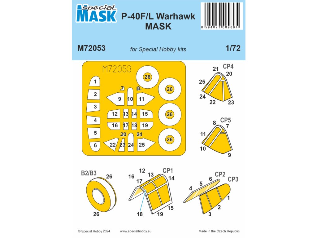 Táto sada maskovacích šablón pre P-40F/L Warhawk v mierke 1/72 od Special Hobby vám umožní presne zamaskovať kokpit a ďalšie priehľadné časti modelu počas maľovania. Šablóny presne zodpovedajú tvarom skla, uľahčujú nanášanie farby a zabezpečujú ostré línie farby. Vyrobené z vysokokvalitného materiálu, ktorý sa ľahko aplikuje a odstraňuje. Balenie neobsahuje farby ani lepidlá potrebné na montáž.