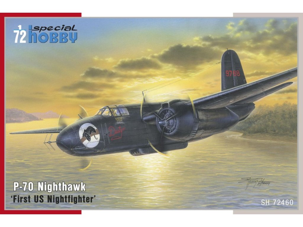 Special Hobby 1/72 P-70 Nighthawk 'First US Nightfighter' je detailne spracovaná plastová stavebnica nočného stíhacieho lietadla vyvinutého z ľahkého bombardéra A-20 Havoc. Tento stroj, nasadený v Tichomorí a na výcvik v Spojených štátoch, je v stavebnici detailne prepracovaný a má štyri atraktívne kamufláže. Balenie neobsahuje farby ani lepidlo potrebné na zostavenie.