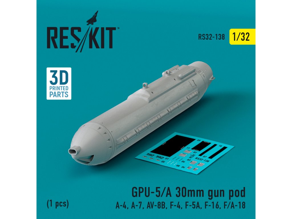 GPU-5/A 30mm gun pod (1 pcs) (A-4, A-7, AV-8B, F-4, F-5A, F-16, F/A-18) (3D Printed) (1/32)
