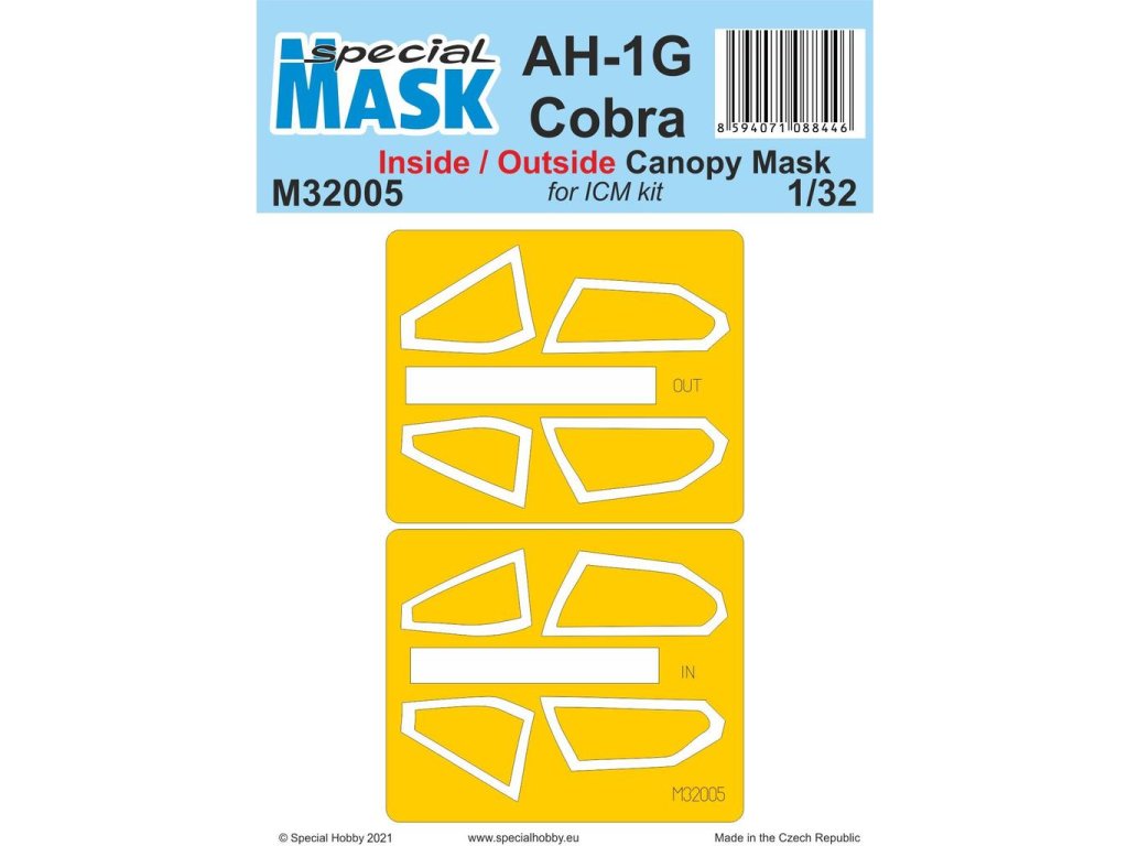 Sada šablón na maskovanie AH-1G Cobra v mierke 1:32 od Special Hobby umožňuje presné maskovanie kokpitu zvonku aj zvnútra, čím sa dosiahne realistické namaľovanie s ostrými líniami. Šablóny presne kopírujú tvar skla, čím uľahčujú prácu s farbou a minimalizujú riziko jej presakovania. Vyrobené z vysokokvalitného materiálu, ktorý sa ľahko aplikuje a odstraňuje. Balenie neobsahuje farbu ani lepidlá potrebné na montáž.