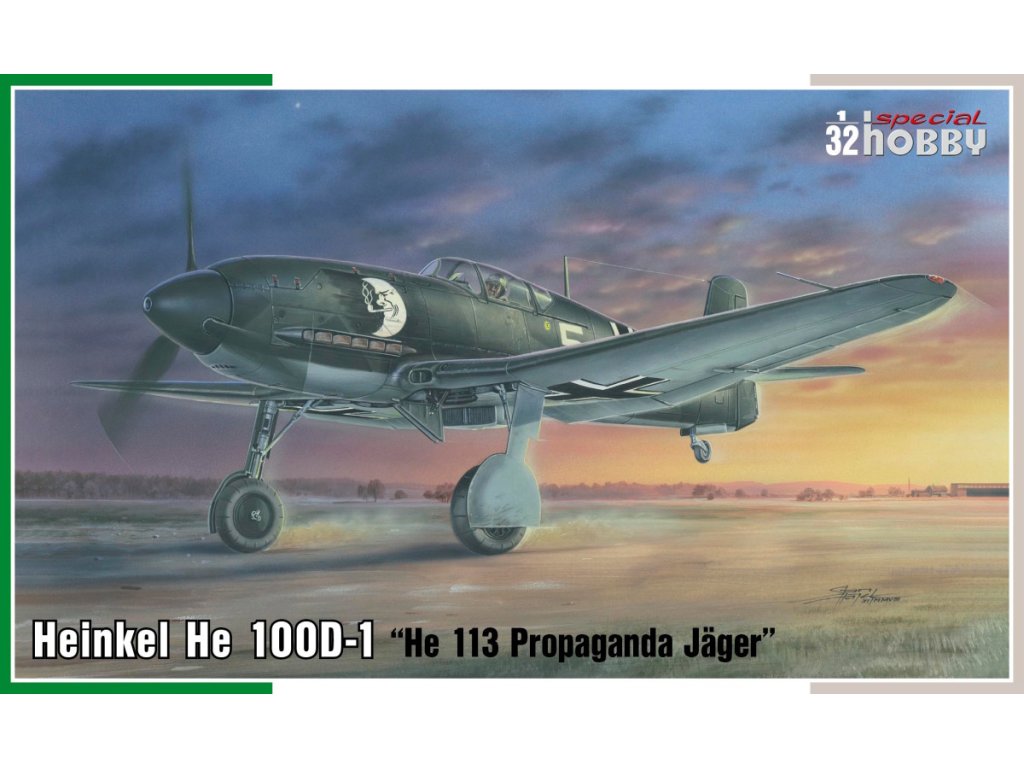 Heinkel He 100D-1 "Propaganda Jäger He 113" v mierke 1/32 od Special Hobby je nemecké experimentálne stíhacie lietadlo z obdobia pred druhou svetovou vojnou. Hoci bolo vyvinuté ako konkurent Bf 109, nikdy sa nedostalo do sériovej výroby. Namiesto toho sa používalo v propagande ako fiktívny "He 113", ktorý údajne slúžil v Luftwaffe. Model má detailne prepracovaný aerodynamický trup, unikátny chladiaci systém a kokpit. Balenie neobsahuje farby ani lepidlo potrebné na zostavenie.