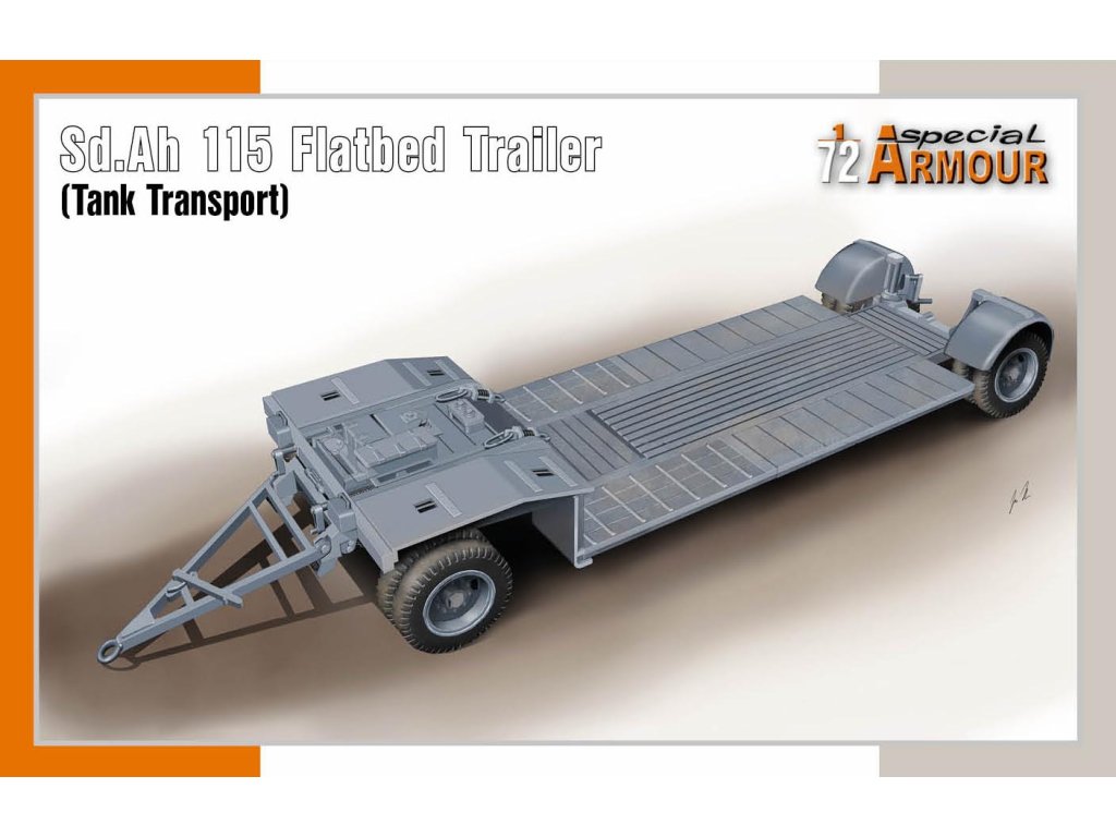 Sd.Ah 115 Flatbed Trailer (Tank Transport) v mierke 1/72 od Special Hobby je nemecký ťažký príves určený na prepravu tankov a ťažkej vojenskej techniky počas druhej svetovej vojny. Tento príves bol ťahaný výkonnými ťahačmi, ako napríklad Sd.Kfz. 8 alebo Sd.Kfz. 9, a umožňoval efektívny pohyb obrnených vozidiel po cestách aj v teréne. Model ponúka detailné spracovanie podvozku, plošiny a prídavných zariadení. Balenie neobsahuje farby ani lepidlo potrebné na montáž.
