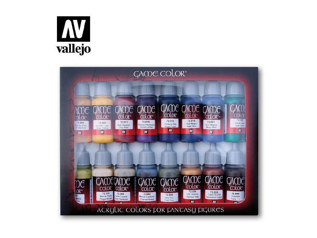 Sady Vallejo Game Color ponúkajú starostlivo vybrané vysoko pigmentované akrylové farby s pružným saténovým povrchom, ktoré sú špeciálne navrhnuté na maľovanie fantasy a sci-fi figúrok. Každá sada sa zameriava na konkrétnu tému - napríklad textúry kože, brnenia, tóny kože, OSL efekty, nemŕtvi, orkovia alebo NMM (Non-Metallic Metal).