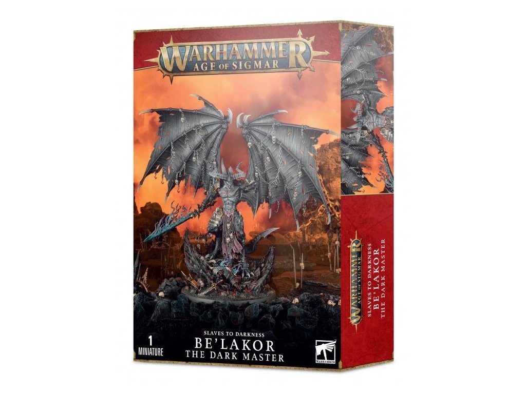 Warhammer Age of Sigmar: Be'lakor, the Dark Master is a plastic model of a fantasy character designed for painting. The kit contains 85 pieces to build Be'lakor, the Dark Lord, and comes with a 100mm diameter base. The model offers variants for the Slaves to Darkness army (Warhammer Age of Sigmar), the Chaos Daemons army (Warhammer 40,000) or a neutral version suitable for both games. The package does not include the paint or glue needed for assembly.